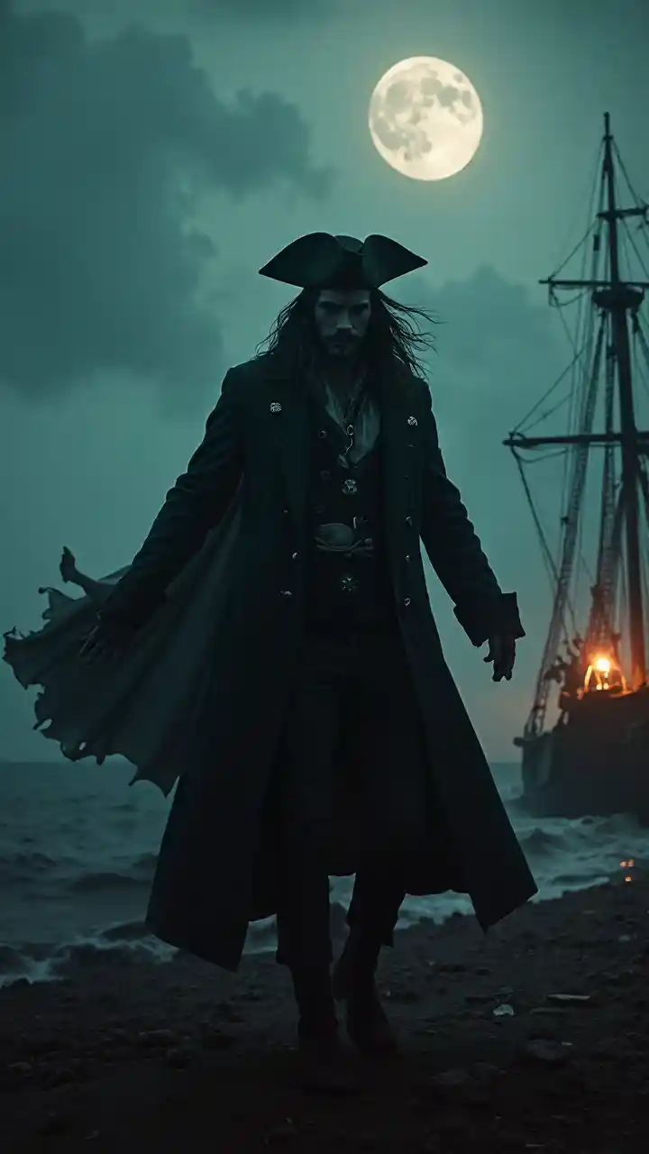 Джон Карпентер, охлаждающий вечер Хэллоуина, Брэд Питт в роли угрожающего пирата, жуткий корабль-призрак, сюрреалистический страх, очарование Хэллоуина, кинематографическая фотография, съемки, движение, эпическое, высокая четность