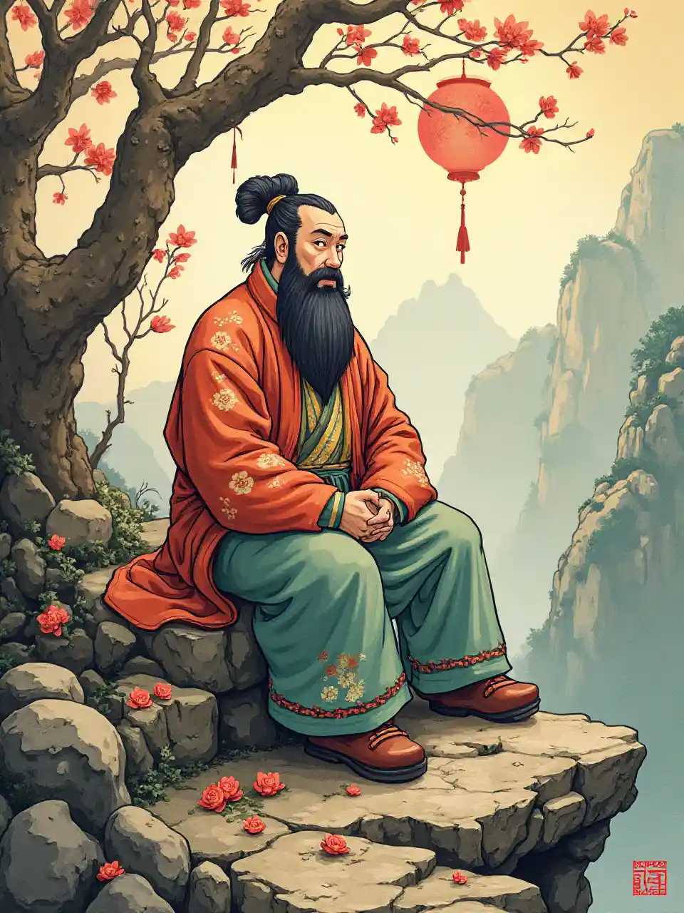 Китай стоит на небольшом облаке, облачко чуть выше земли, человек и облако мелким планом далеко, китай одет в традиционную китайскую одежду, ноги китайца не видно тонут в облаке, руки сложил за спиной, этот китай далеко он маленький, вокруг равнины и луг с травой и легкий туман, экранизация китайских народных легенд