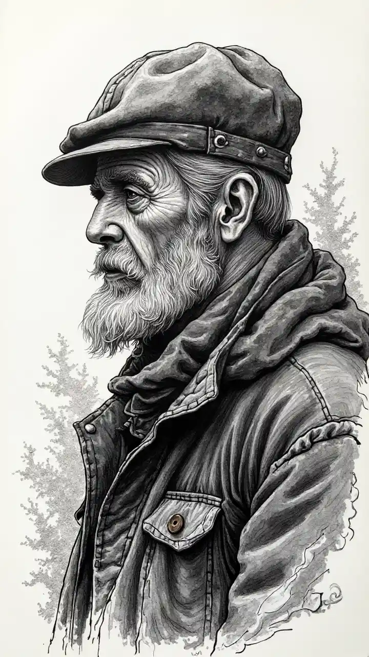 Портрет старого шахтера в XIX веке, перо и чернила, сложные чертежи