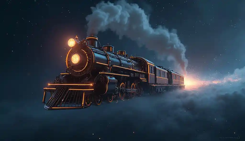 MaverickЗвездный Движение , футуристический паровоз , который летает в космосе , стейпанк , высокое качество изображения , шедевр , Тминкающие звезды , Космическое пространство , темный пейзаж