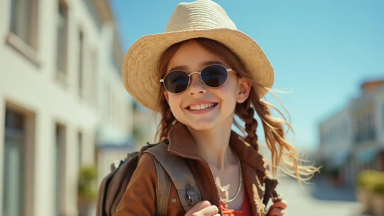 Фото счастливая девочка собирается путешествовать, милая девочка, кожаная куртка, соломенная шляпа, солнцезащитные очки, Харперс, странный, обложка, фото с головы, гиперреалистичный