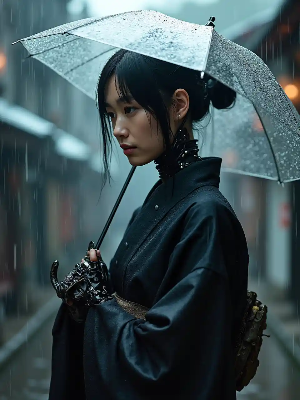 Oliviaженщина-киборг, изготовленная из металла, носящая черную юката из углеродного волокна, она держит прозрачный зонтик, под сильным дождем.