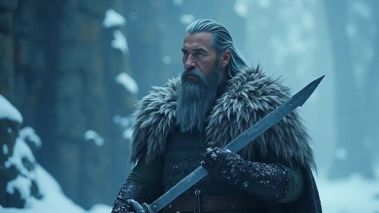 MichaelСтарый король-воин викинга с длинной бородой, темная сцена, темная атмосфера, эпический снимок, четкая на детали, замершая тундра, вечный снег и лед, серебряный и ледяный синий