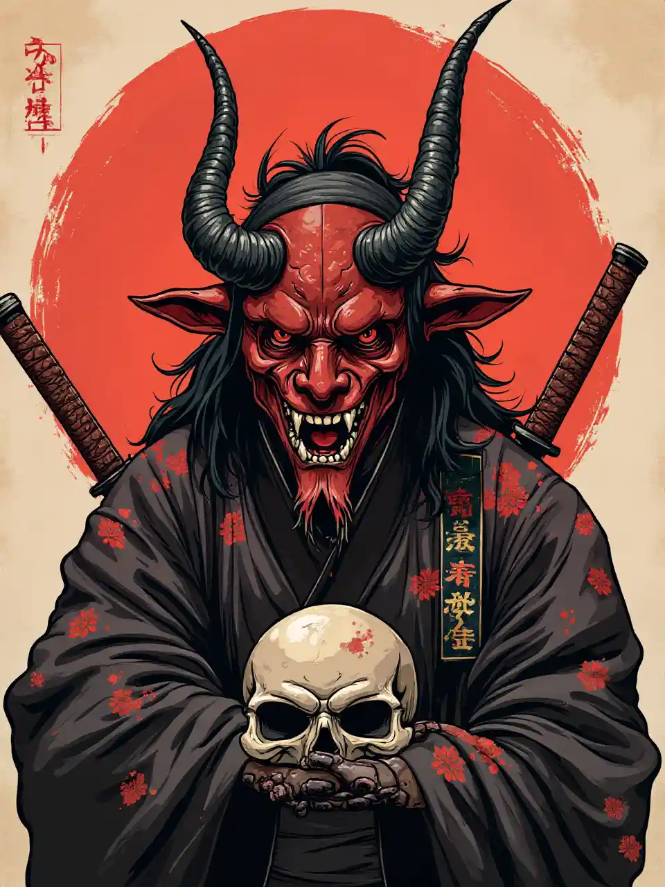 Иллюстрация демона с двумя мечами и черепом, маска демона-самурая, маска они, злодей, носящий маску черного они, маска самурая, самурай с маской демона, демона-самурая, воина демона-самурая, рога они, вдохновленные риукосай, японский стиль искусства, вдохновленный кавана киосай, таинственный, красный и черные