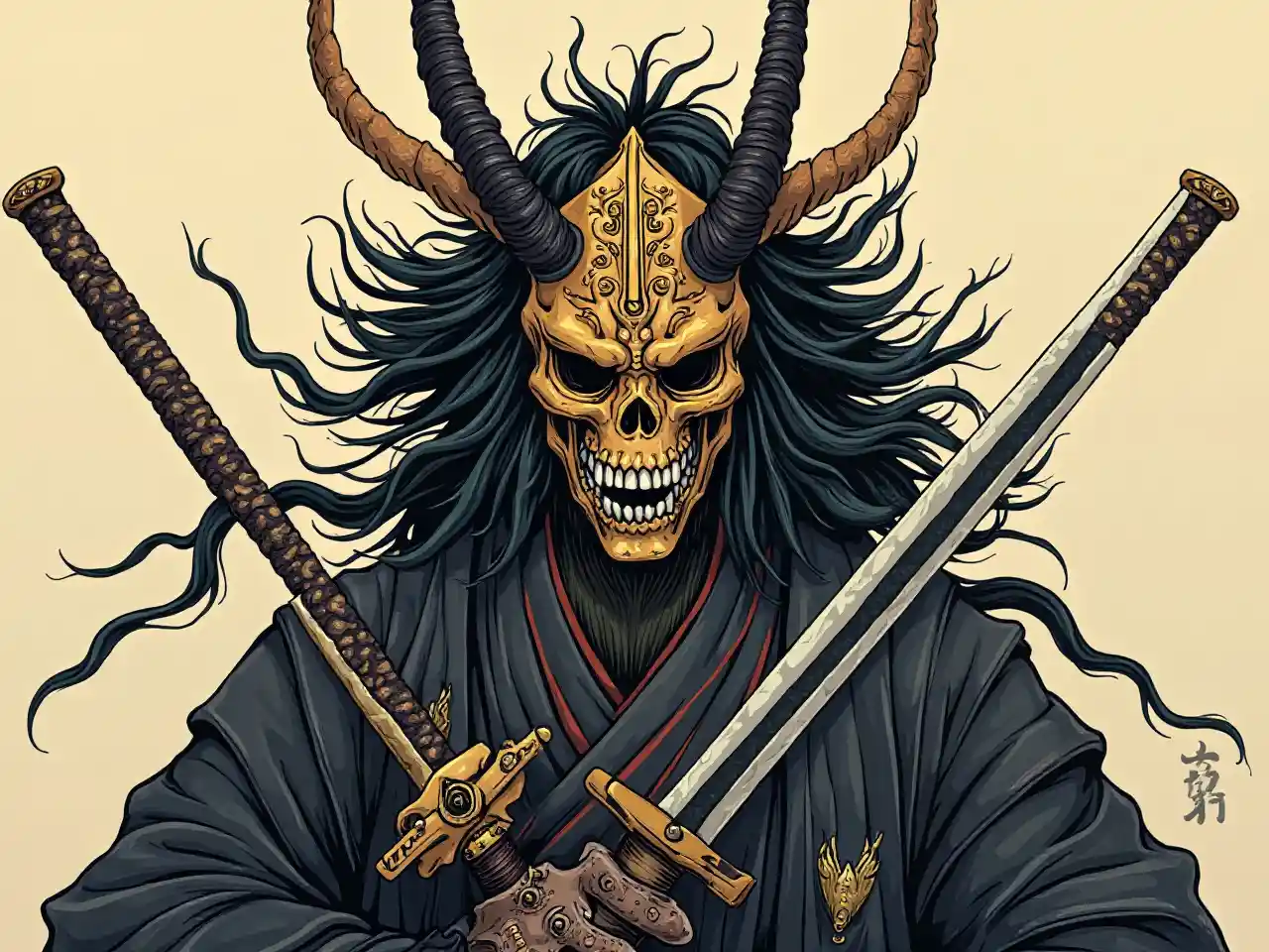 Иллюстрация демона с двумя мечами и черепом, маска демона-самурая, маска они, злодей, носящий золотую маску они, маска самурая, самурай с маской демона, демона-самурая, боевика-демона, рога они, вдохновленные риукосай, японский стиль искусства, вдохновленный кавана, таинственный