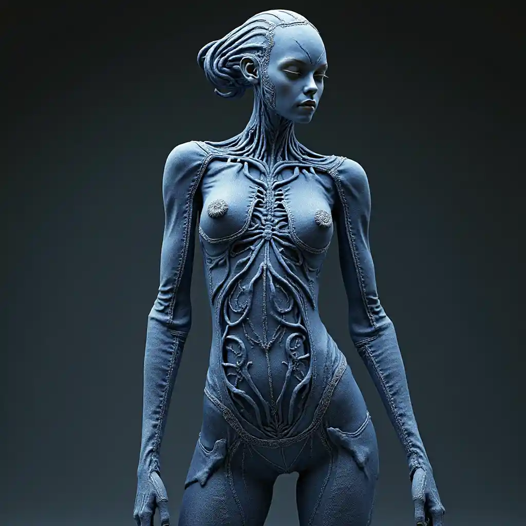 Целое тело: шедевр джинсовой скульптуры 9-глазного худого красивого рыцаря-женщины, полностью сделанного из джинса, с сегментированной 3D джинсовой кожей, с лицом и частями тела и ног джинсов, как джинсовая сосудная система, украшенная искусственным переплетением различных джинсовых швов и джинсовых фрактальных узоров и выши, сложно украшенные узловыми гравюрами, изогнутых раздельных швов и футуристических удлиненных лабиринтовых полос, сверхтонные детали, гиперреализм, филигри, 64k, джинсовый гигер сверхтонными детали, джинсовый рамок, четкость, сверхреалистичные детали,