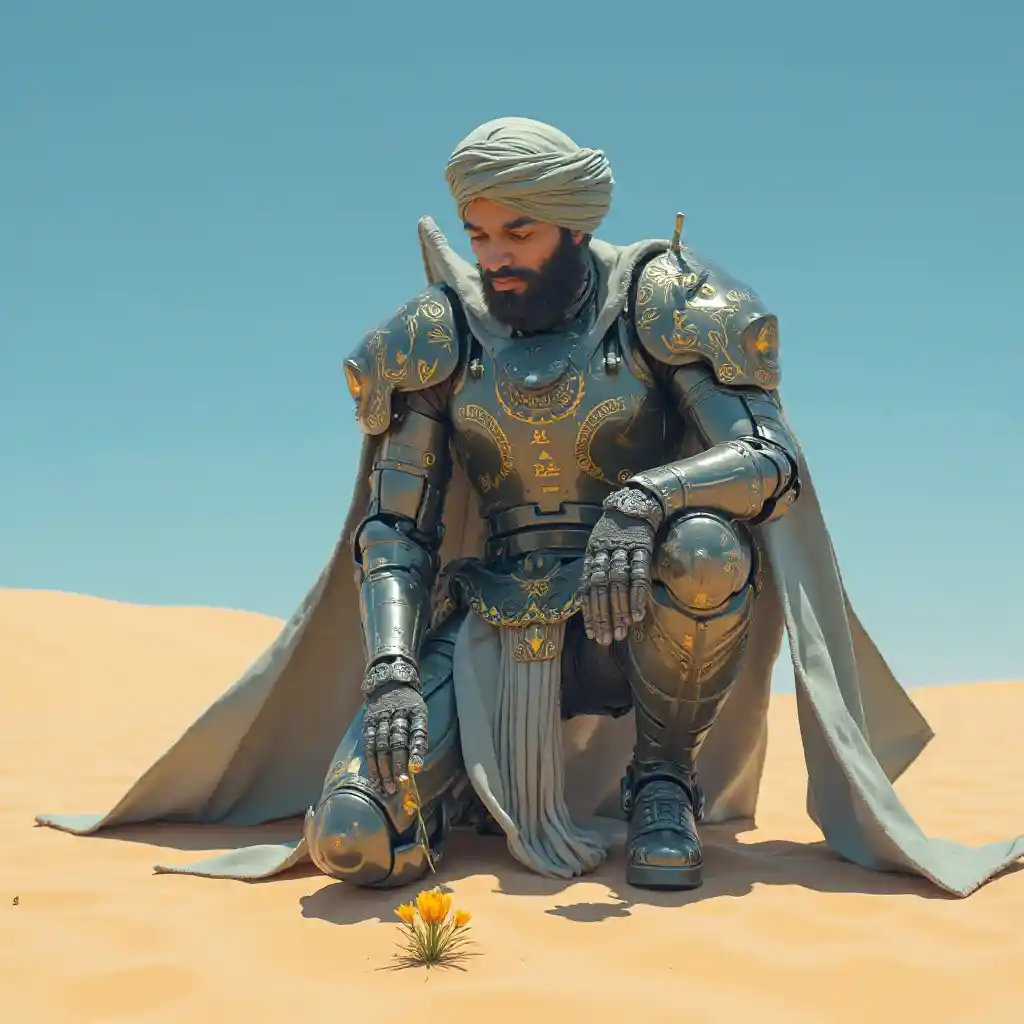 В бесплодном пространстве пустыни, под обширным голубым навесом дневного света, на коленях сикский король, окутанный сложной симфонией культурного и будущего искусства. Его величественный тюрбан увенчался его головой, и он идеально вписывается в силуэта японского экзоскелета. Этот костюм, похожий на Гундма, чудо нео-футуристической технологии, украшен золотой гравировкой из панджаби, которая шепчет о магических силах, отражающих мистический резонанс. За ним разворачивается длинная, тяжелая мантия, которая мягко дует сухим ветром, когда он спускается, чтобы нежно сорвать одинокий цветок, растущий в песке. Лицо этого царского воина скрыто под хитроумным металлическим покрытием, загадочным лицом, который смотрит на вечной пустыне. Каждая панель его углеродной брони является свидетельством точности, тщательно выгравировано наследием как воинов, так и поэтов. Это сочетание временно сцепляющихся эпох, романтизирующее сопоставление современной истории и передовых технологий, раскрывающих мельчайшие детали, которые призывают к более пристальному осмотру. Вдохновленная визуальным повествованием легенд, от футуризма Акиры до эпических видок "Звездных войн", сцена запечатлела момент спокойного самоанализа среди бесконечных песков. Это произведение искусства ориентируется на видные стили таких мастеров, как Акира Куросава и Норман Роквелл, взаимодействуя с мощным воображением Сида Мида, Бориса Валье, Жана Жиро Мобиуса, Джона Берки, Евгения Делак и Рембрандт Ван Райн. Это картина, знакомая и чужая, где каждый элемент служит усилению спокойного, но вызывающего благоговение повествования.