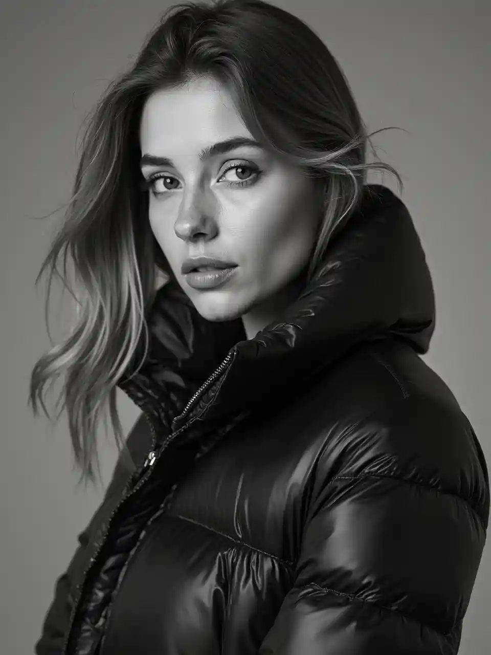 KennedyЧерно-белый портрет женщины-дизайнера в блестящем пальто смотреть на камеру