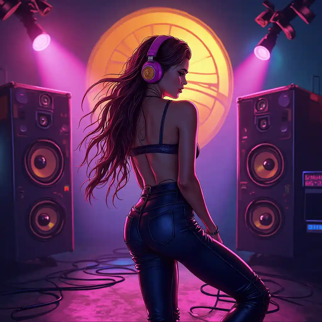 Создать образ для дискотеки 80-х годов Нового года с использованием флурочернил, и включать женского диско танцовщицы с наушниками, бум-бокс, динамики, синтез, ретро-футуристический стиль с золотым зеркалом, неоновые экраны