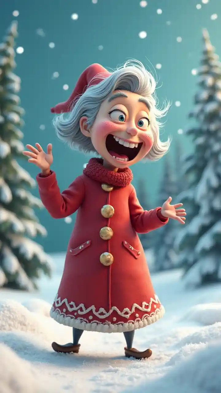 Д-р Сьюз в стиле Д-р Сьюз смеялся бабушка жестом 3D анимация в BG егосическая зима, полное тело, экстремальный дальний взгляд