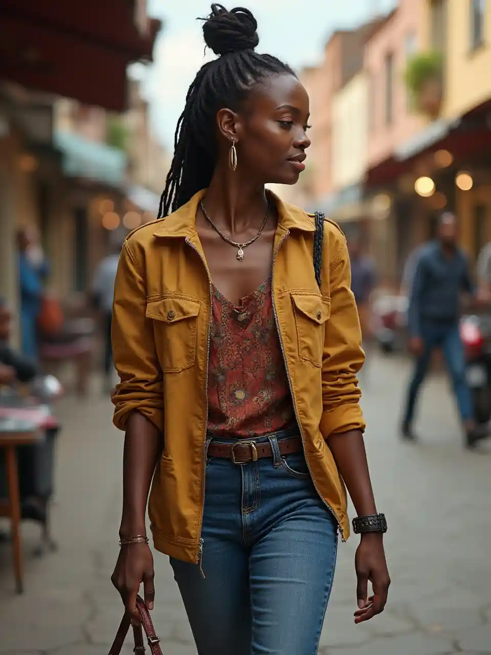 DanielМолодая восточноафриканская женщина, идущая по главной улице, в деталях одета, реалистичная, естественная