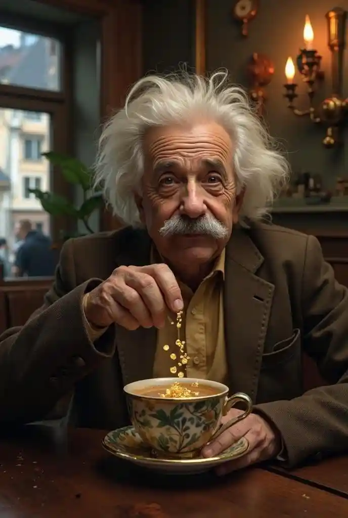 Альберт Эйнштейн сидит в одном кафе ретро-панка, в руке висят в чашке кофе с частицами E=gold с формулой mc2