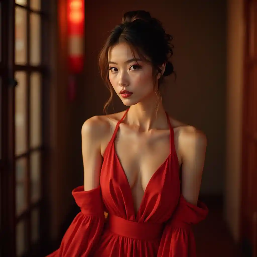 потрясающая элегантная 50-летняя китайка, полная поза тела, супер тонкий и тонированный физический состав, великолепное тело, идеальный силуэт, длинные волосы, связанные в беспорядочном буханке, мягкое освещение, теплые и приятные цвета, излучающие уверенность и грацию, высокая мода красное платье, гламур, сверхдетализированный портрет, захватывающее выражение, красиво сбалансированная композиция, подчеркивающая привлечения и, высокое качество изображения, идеально для демонстрации красоты и расширения возможностей.