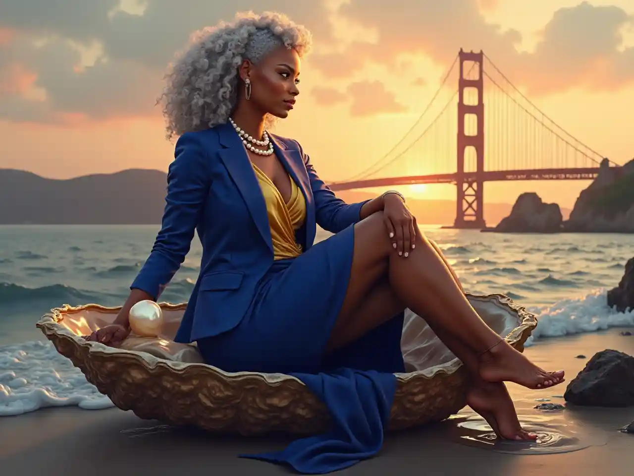 Создайте гиперреалистичную цифровую картину потрясающей и уверенной в себе, изогнутой, пожилой и зрелой афроамериканки с богатой, глубокой кожей, сидящей элегантно на массивном устрице с жемчугом, одетой в изыска королевского голубого юбка с золотой блузкой, на которой находится нитка жемчуга, излучающей силу и грациозно. Ее серебристые, закрученные волосы обрамляют ее лицо, когда она смотрит вперед сдержанно. На заднем плане - знаменитый мост Золотые Ворота на закате, окутанный теплым золотым светом. Общее настроение роскошное и укрепляющее, смешивающее реализм с художественным талантом. Убедитесь, что изображение анатомически точное, с точностью две ноги и руки без дополнительных пальцев.