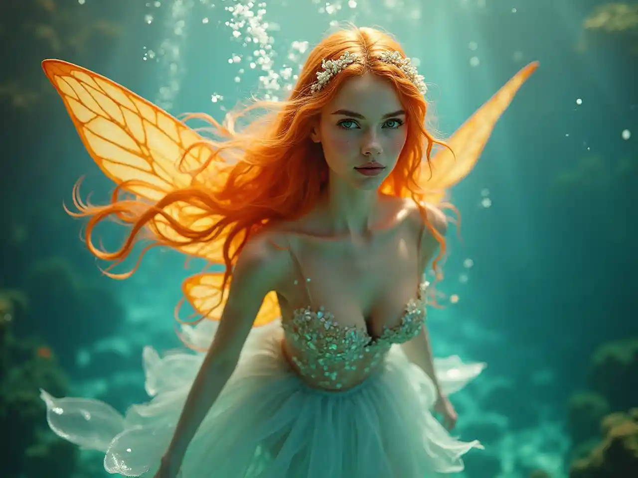 (((суреальная эфирная фея)) с теющими, (((длинными, блестящими имбирными волосами))), одетая в ((транслюцентный, радужный костюм феи, который идеально дополняет ее эфирные черты))), несложно сочетающаяся с яркой цветовой палитрой ультрареалистичных, мерцающих вод, отражающих эфирный свет. Сцена еще больше подчеркивается (эфирными пузырями) в оттенках глубокого желтого и светлого синего, которые мягко танцуют вокруг нее, усиливая причудливую подводную атмосферу. Глаза фей блестят чувством загадки и удивления, отражая магию и элегантность подводного мира.