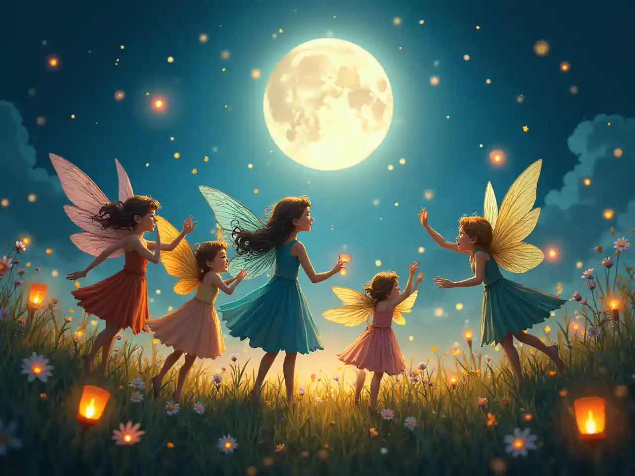 "Группа фей празднует на лунном лугу, окруженная сияющими цветами и крошечными плавающими фонарями. У каждой феи уникальные, красочные крылья, и они танцуют в волшебном вихре света и искр".