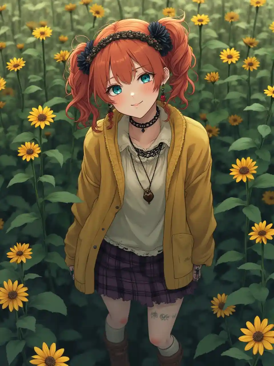Концептуальное искусство, ковбойская фотография, 1девочка, легкая улыбка, наклоненная голова, вариза, переросшее цветочное поле, сверху, феи, голубые глаза, имбирные волосы, беспорядочные локоны, хвосты, сушеные цветочные короны, черная далия, засохшие желтые цветы, черная цветочная корона, страдающий кардиган, горчичный желтый кардиган, извилистые края, свободно вязанный, белокосовая блузка, широкий воротник, слойная одежда, темно-фиолетовая юбка, черепичная мини-юбка, сырой шер, высокие носки, изряженные коричневые ботинки, несовмещенные сере, черного кружка, подвеска, грамовые браслеты, отрезанный черный лак для ног, странный настрой, земные тоны, зеленые, моры, мягкий стиль, красивая, красивая, красивая, с лег , объемное освещение, динамический угол, эпическая композиция, эпические пропорции, , шедевр, лучшее качество, удивительное качество, очень эстетичный, абсурдный, новейший, подробный фон, подробная среда
