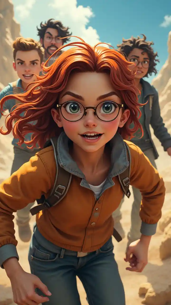 SawyerОжесточенная 13-летняя студентка с очками впереди, а ее этнические друзья на заднем плане, ее локоние волосы, бьющие в ветре, когда она ведет свою команду на смелое приключение