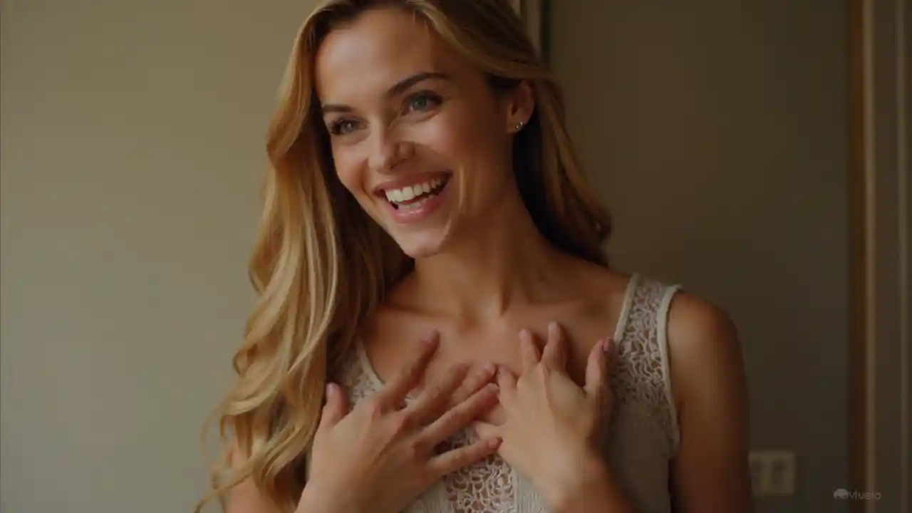 Она флиртует к камере, как только приближается, она касается груди обеими руками и улыбается соблазнительно.