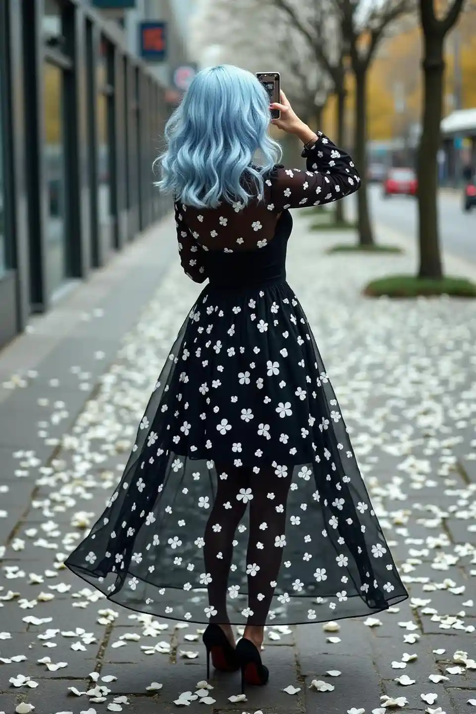Женщина с светло-синими длинными волнистыми волосами носит черное платье с бесчисленными белыми лепестками и на ней черные каблуки