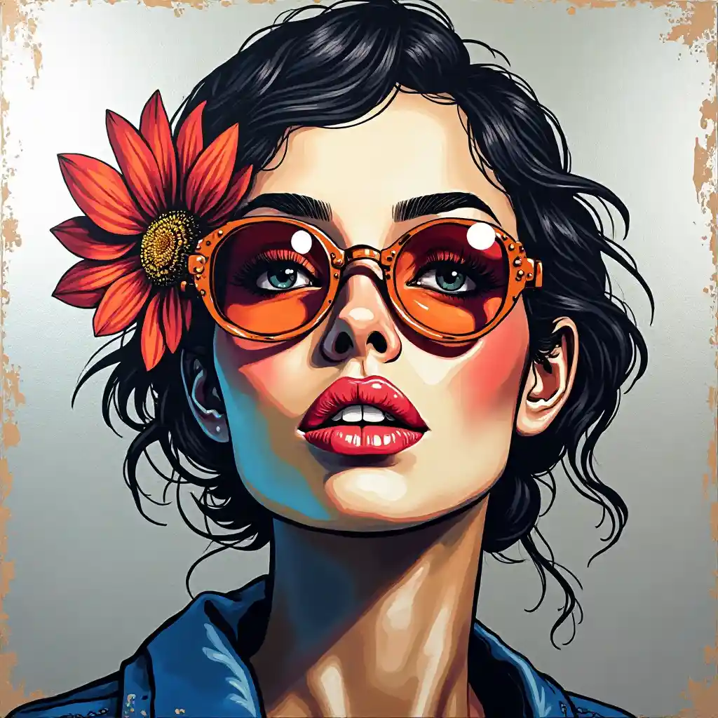 Женщина поп-арт полотна, носящие круглые очки, цветок на стороне ушей, мадд по холсту абстракт, портрет, фон серебра белого