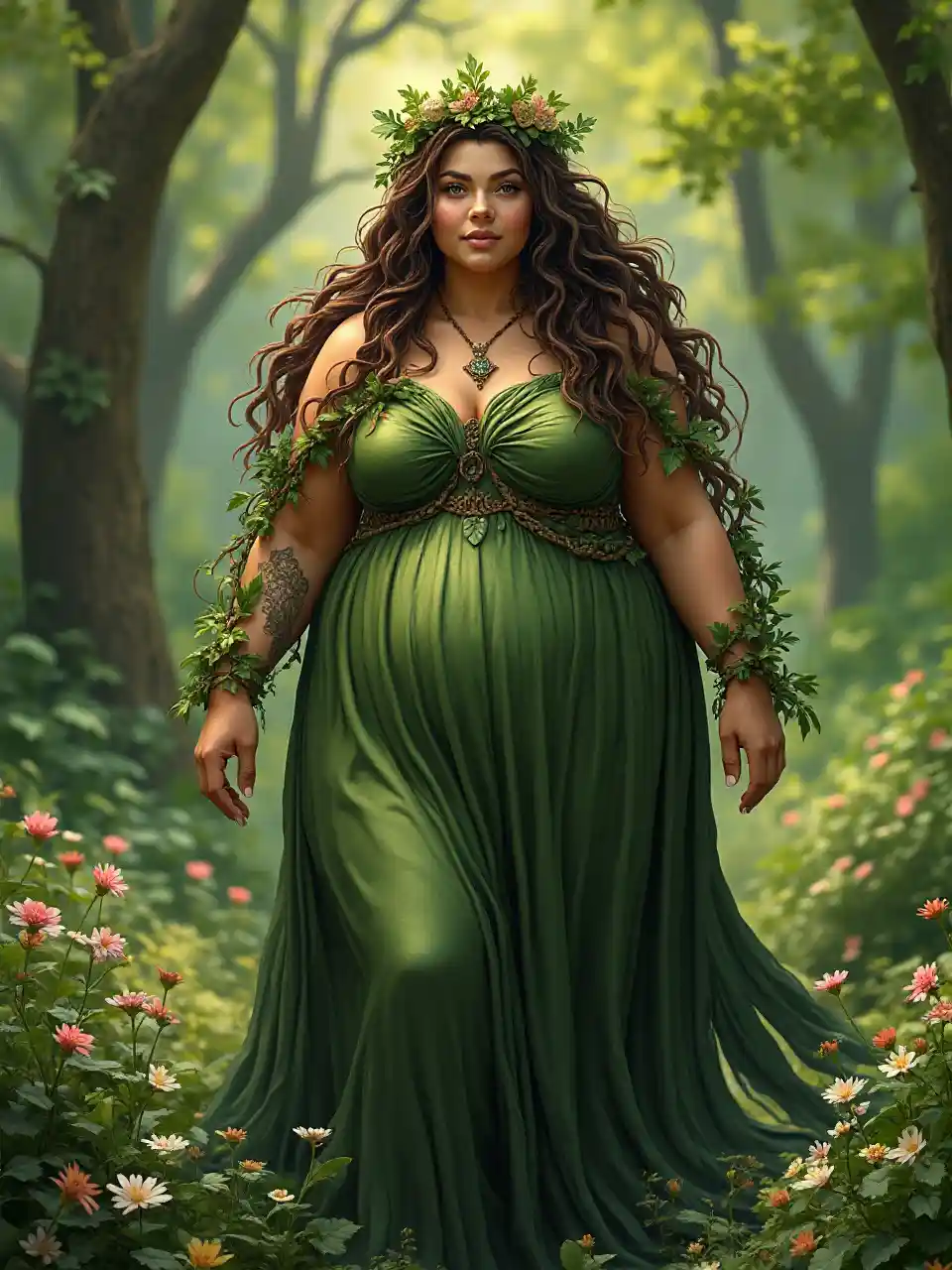Осень - самка нимфа - жирная - с длинными коричневыми локонами с листами, плетущимися через локоны - носящая ветви и короны листьев - она часть дерева - она имеет кору и ветви на ее коже - она имеет природу как часть ее одежды - она на пол длины греческого стиля платье из листьев и коры и цветов - кора является частью ее кожи - она полной женщины- она зрелая - смешанная раса кожи - она в лесу, полный света, Зелёная растительность, и цветы - носящие большие ветви и ветви и листья короны - листья наворачиваются ее руки растут из земли листья наворачиваются в ее волосы