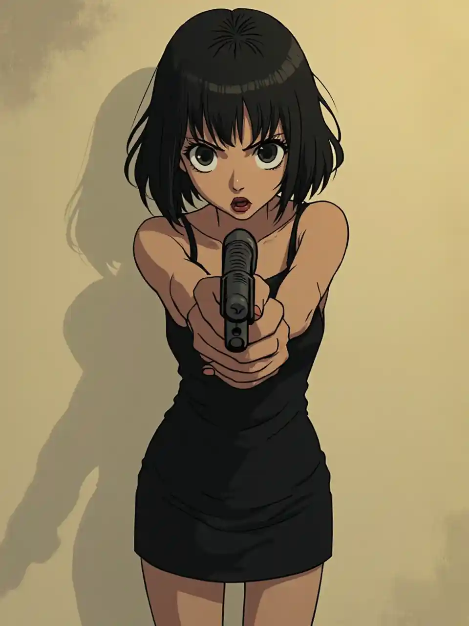 на простом фоне, стреляя из пистолета Colt M1911A1 .45 калибра, полный корпус, дизайн персонажа, красивая женщина, яростное выражение, с черным бобом, простое короткое черное платье с плечами, полные губы, большие глаза, мрачные и жуткие, объемный свет, сепия.