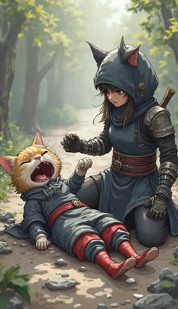 GabrielКомедическое противостояние между девочкой-котом и девочкой-собакой, девочка-котом одета как ленивая ниндзя, лежащая и зевая, девочка-собака в спортивной доспехе, готовая сражаться с