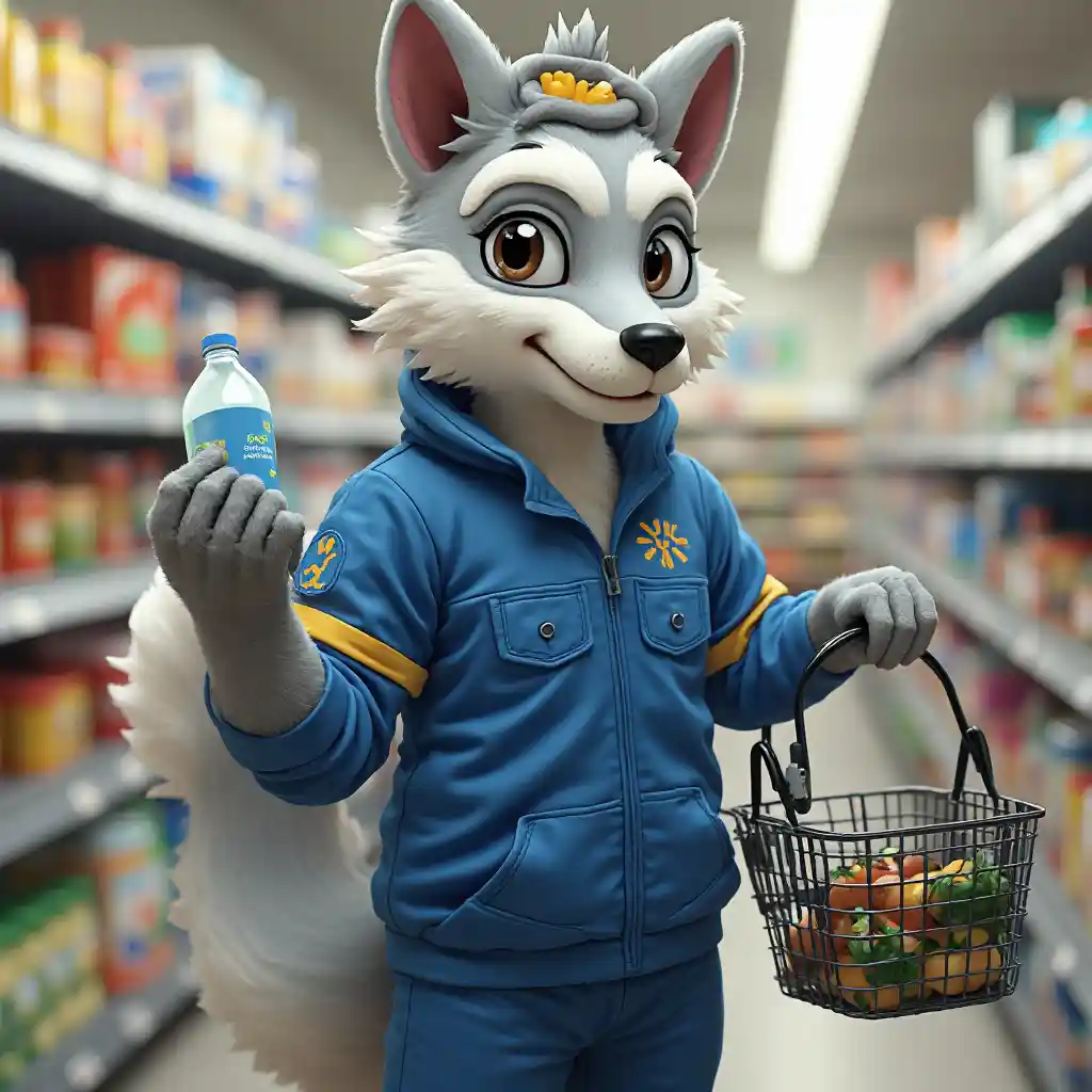 LeviЦифровое изображение пушистого сергала в униформе Walmart, держащего бутылку и глядя в корзину.