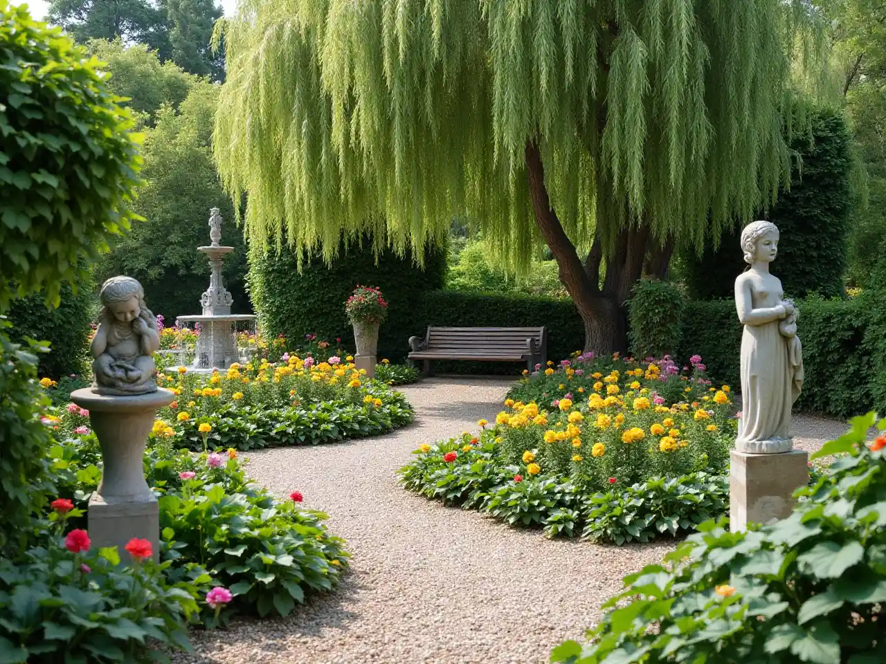 Плодородный сад со статуями, галечная тропа, фонтан, цветы, и скамейка под ило.