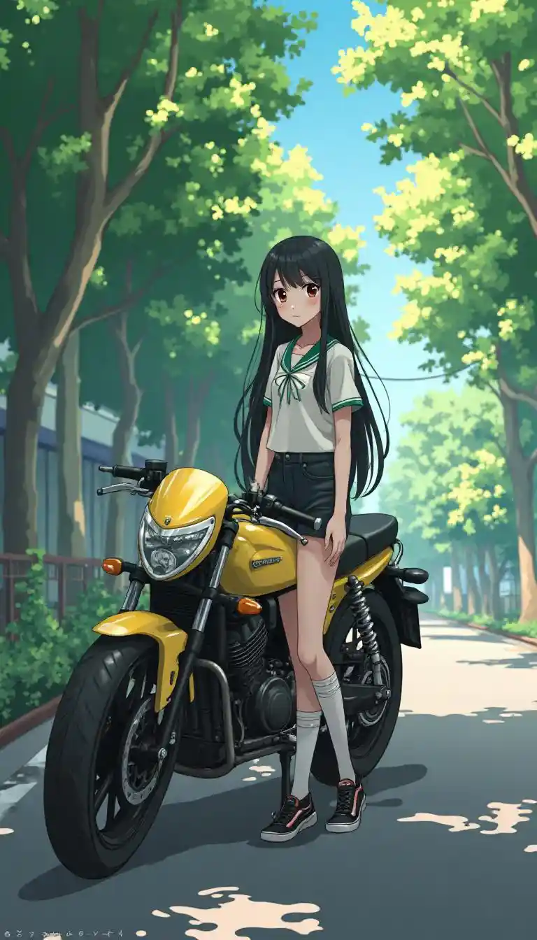 Среди деревьев, рядом с мотоциклом, девушка из средней школы, желто-зеленый мотоцикл, длинные волосы, черные глаза, строй, средняя грудь, у которых есть