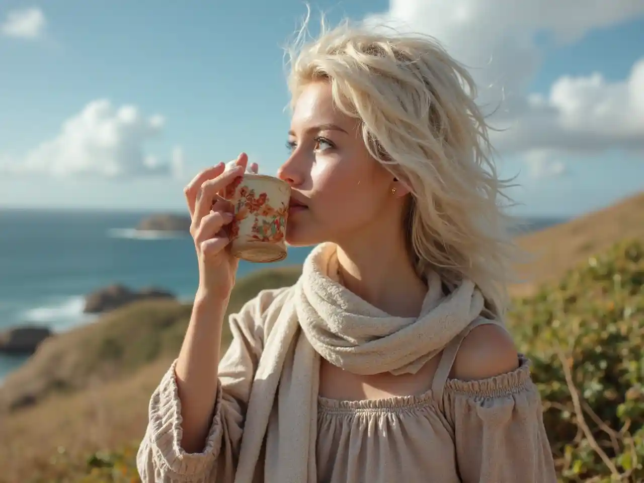 EthanБетуфил белая девушка пьет чашку чая на острове Сент-Мигель.