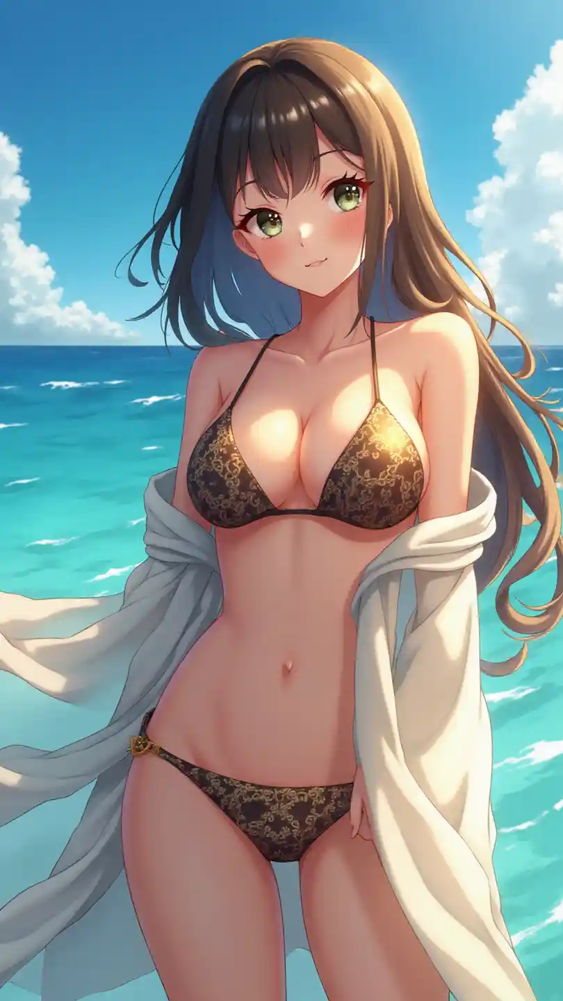 Вертикальное изображение в большом масштабе девушки из аниме Ultra HD, поразительно красивой и уверенной в себе, греющейся на солнце, стоящей на яхте посреди океана на открытом воздухе, одетой в роскошный бикини с глубоким декольте и сарон, ее длинные волосы, текущие в морском ветре и уверенная улыбка, большие мерцающие глаза, сияющая кожа, теплая голубая и золотая палитра цветов, ощутимые черты, идеальный макияж, гламурные и приключенческие вибрации, мягкий светит и естественное освещение, подчеркивая ее увлекающей, хорошо определенных груди с тонким деко, и длинные, с расслабленным позой, излучающей красоту и уверенность.