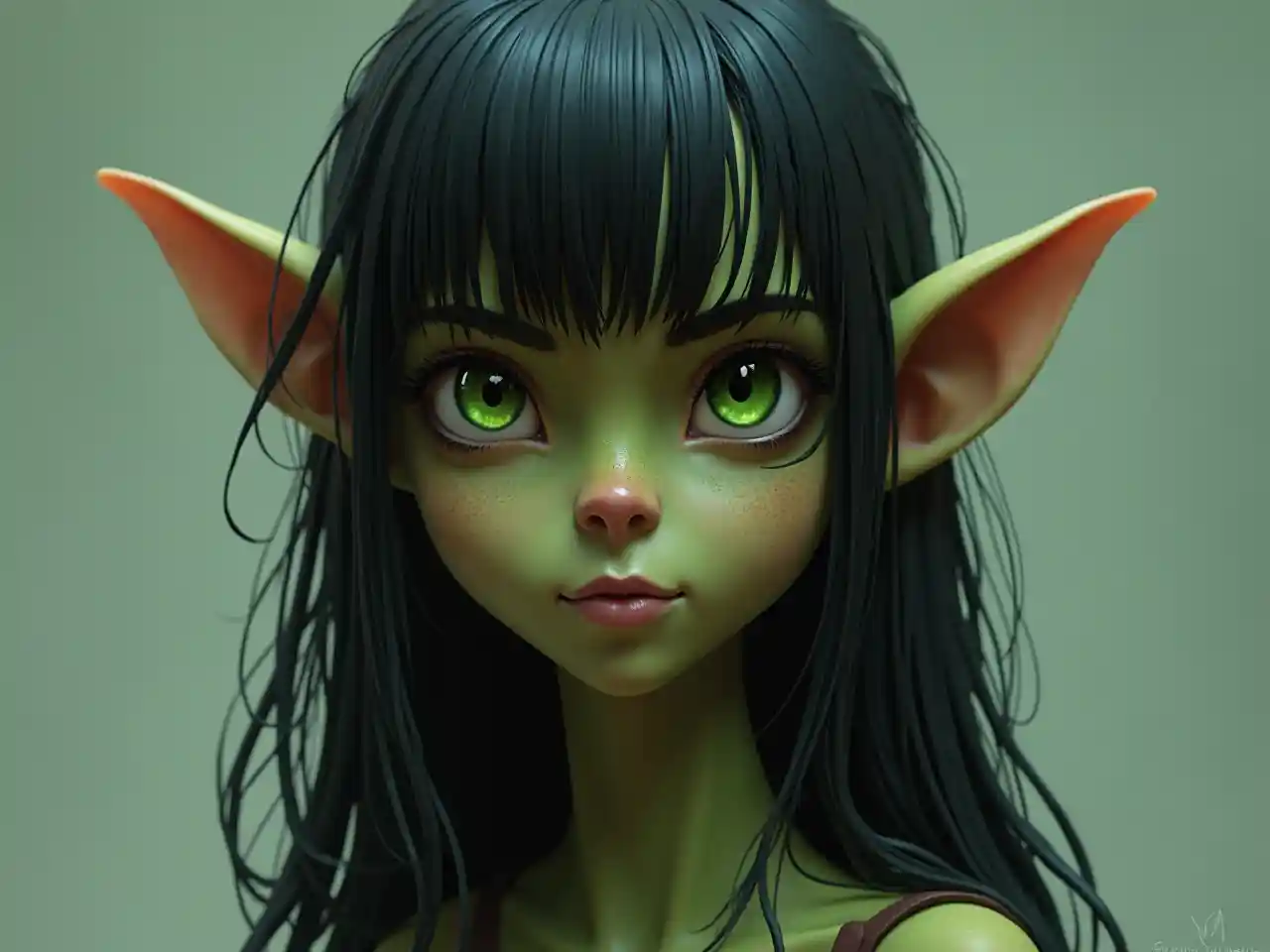SebastianМолодая темно-зеленая женщина-гоблин с длинными волосами и зелеными глазами в 3D-искусстве