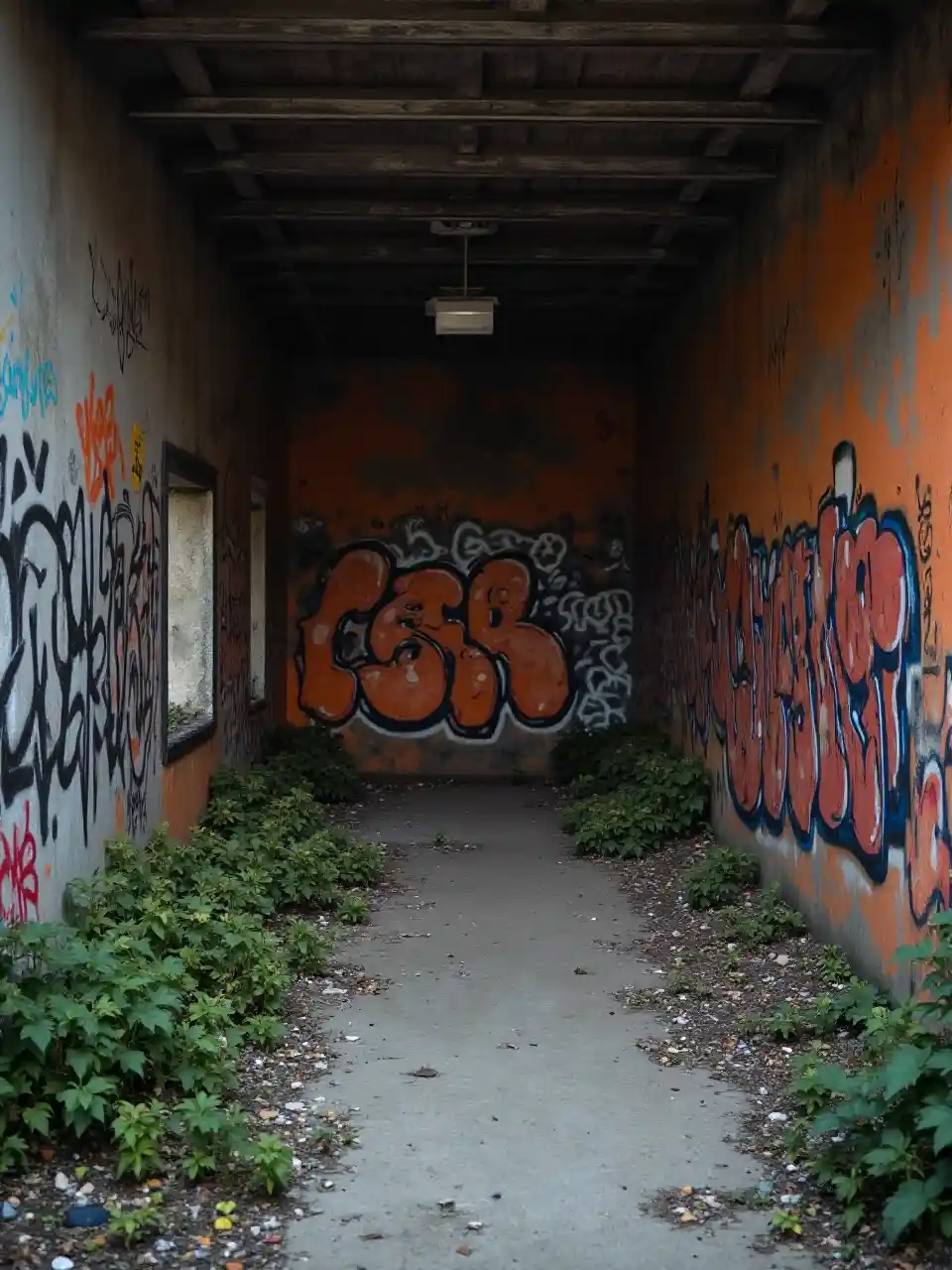 заброшенное хранилище с граффитами черного, оранжевого цвета