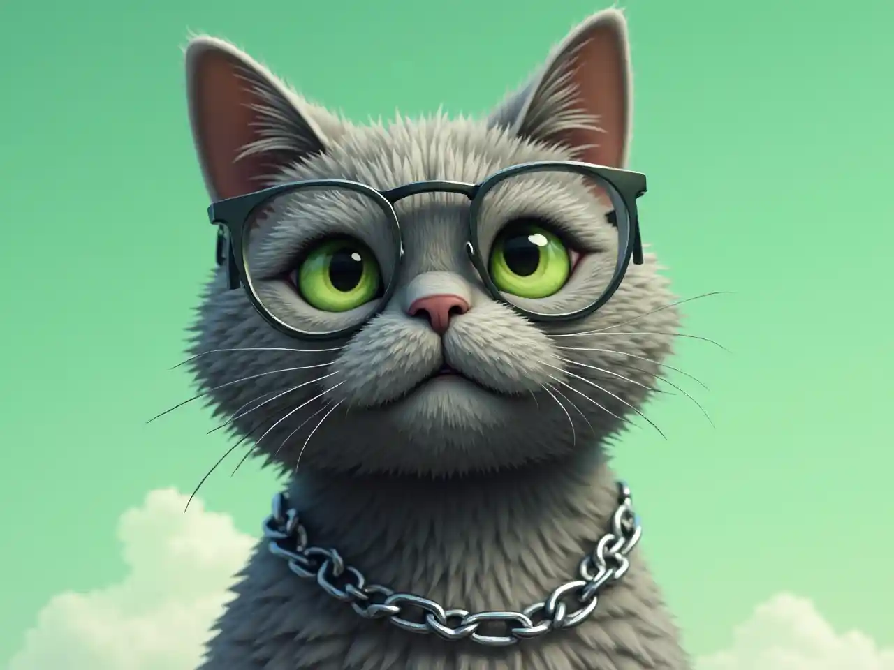 Qinxueсерый кот с зелеными глазами, очки и серебряная цепь перед зеленым небом
