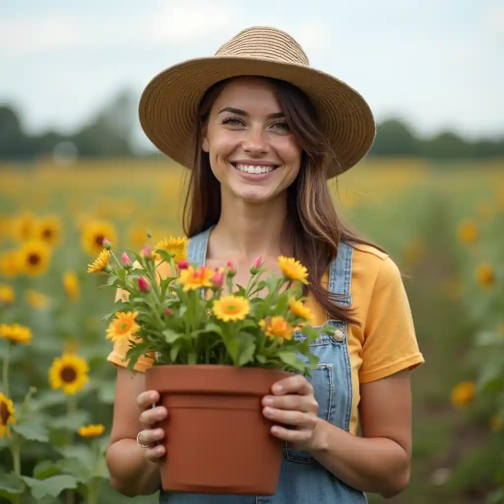Красивая женщина-фермерка улыбается и носит шляпу. Она стоит на поле фермы, держа большой цветочный горшок перед ее грудью.