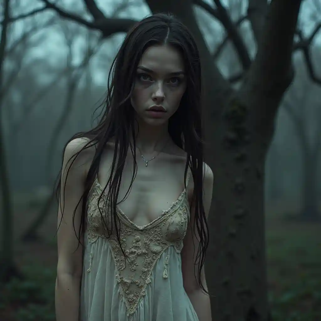 Страшная девушка в разорванном неглиже с деревом-призраком