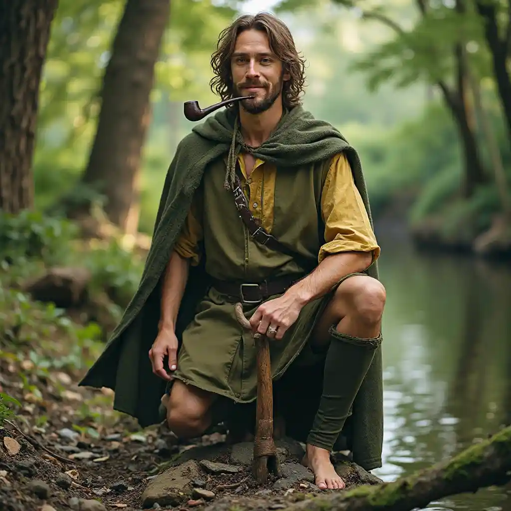 Хоббит-человек, босик, трава-пипа, мужчина, мужчина, короткие, волнистые коричневые волосы, улыбка, Господь Кольцов, босик, одежда хоббитов желтая и зеленая, граф, умный, проницательный, плащ, жилет, скрытый, billhook, на бере реки