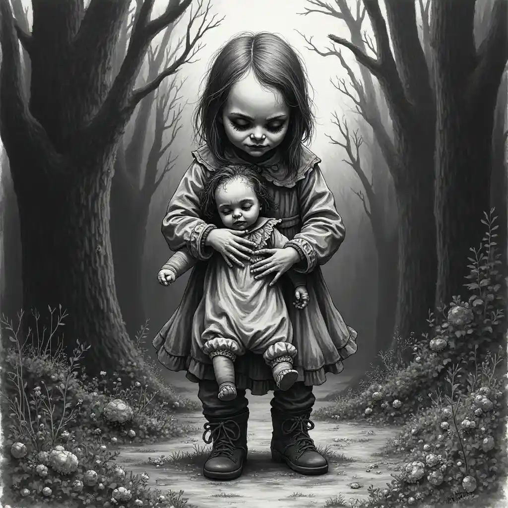 DavidБезликий ребенок держит сломанную куклу посреди темного леса, искусство ужасов в кросс-шачинге, с высокими контрастными деталями.