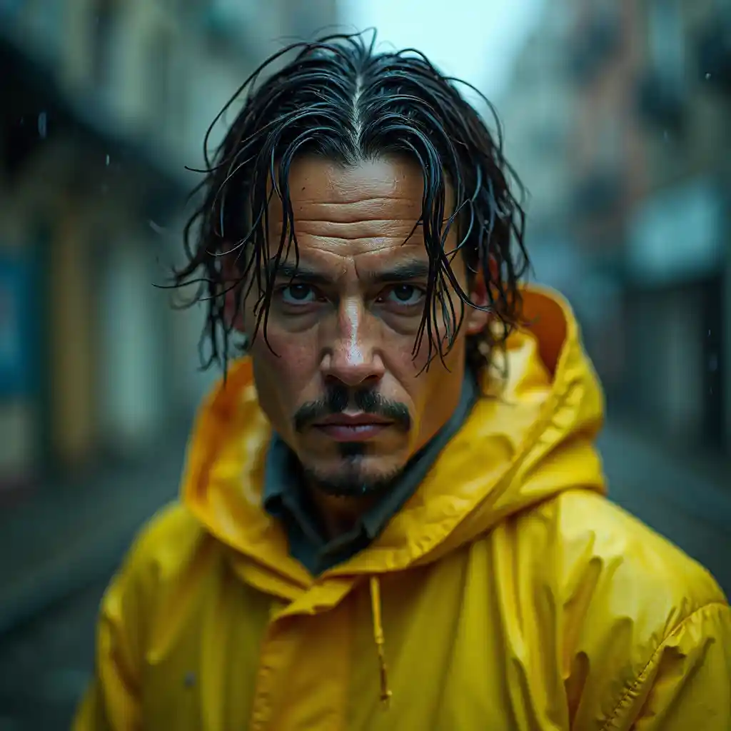 2000-е годы: фото в виде RAW, фотореалистичный, пленка, открытая камера, цветные фильмы, световые приборы, атмосферное освещение, макрофо, поры кожи, несовершенные, естественные, портрет Джонни Деппа в желтом плаще, стоящем под дождем с мокрыми волосами и, реалистично, очень детально, фотография среднего формата, разрешение 8K