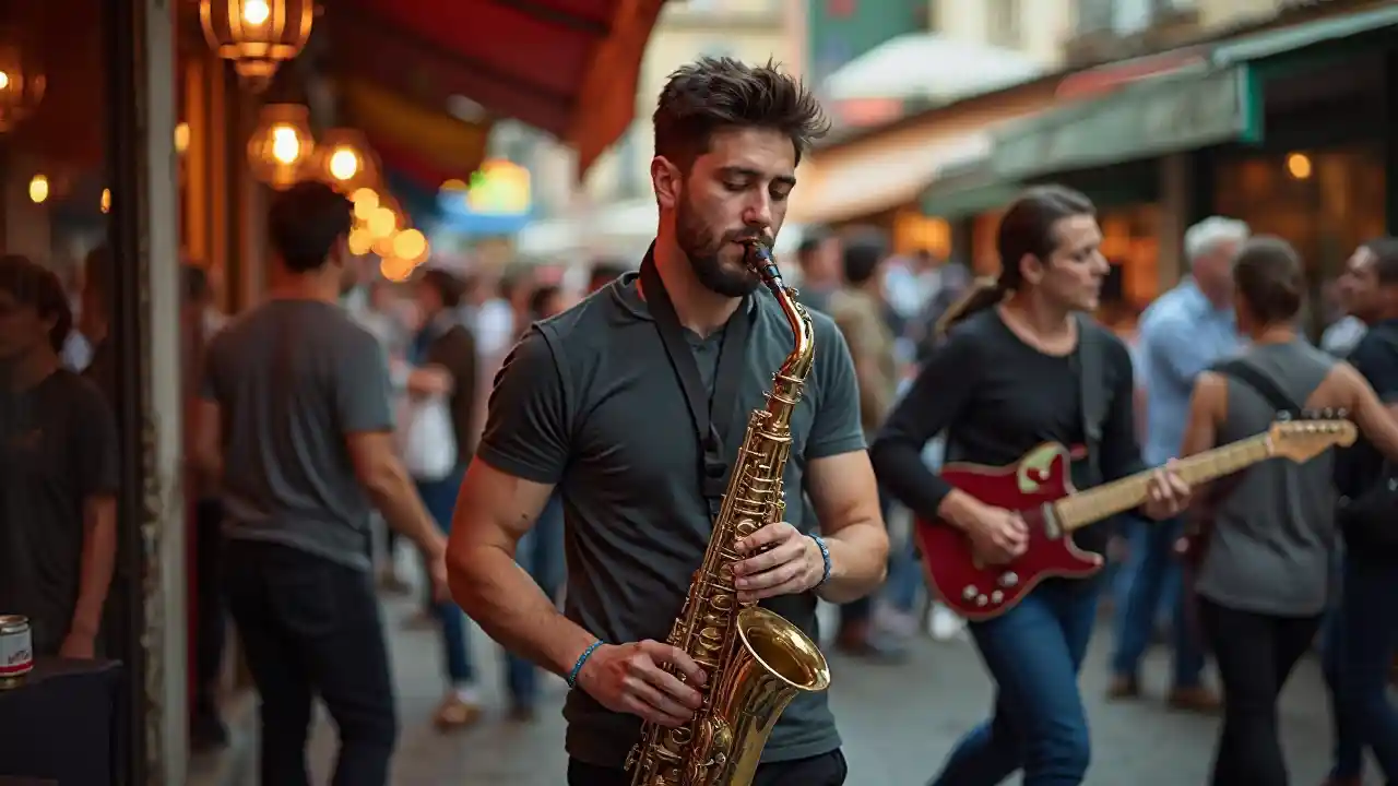 Юный уличный музыкант, очень веселый, 22 года, играет на саксофоне на уличном рынке