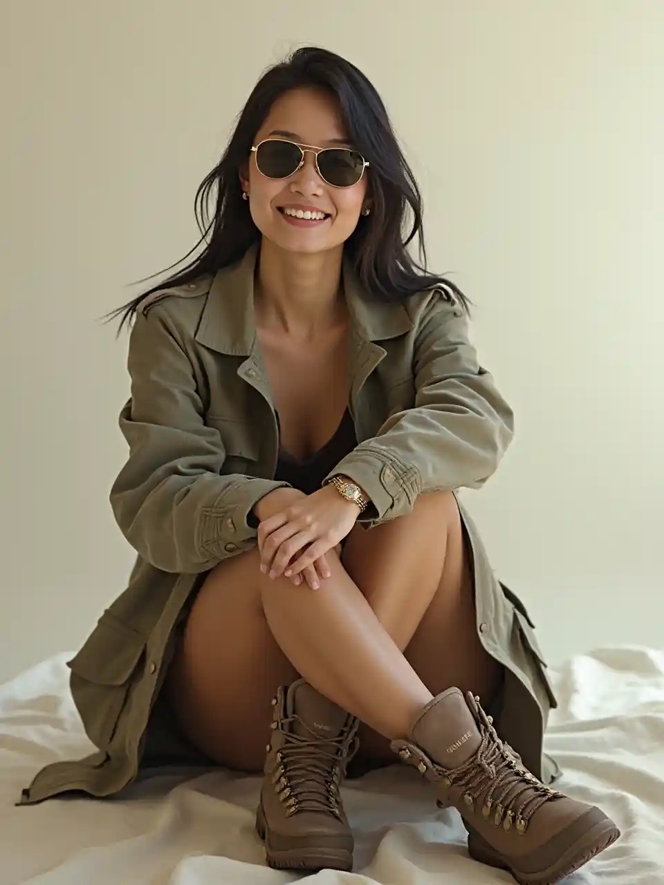 Азиатка с дружественным отношением, светлый фон, удаленный снимок, реалистичная, носит солнцезащитные очки, куртку сафари, сапочные ботинки, выглядит как Ким Ченг с загоранием, сидя скрещенные ноги