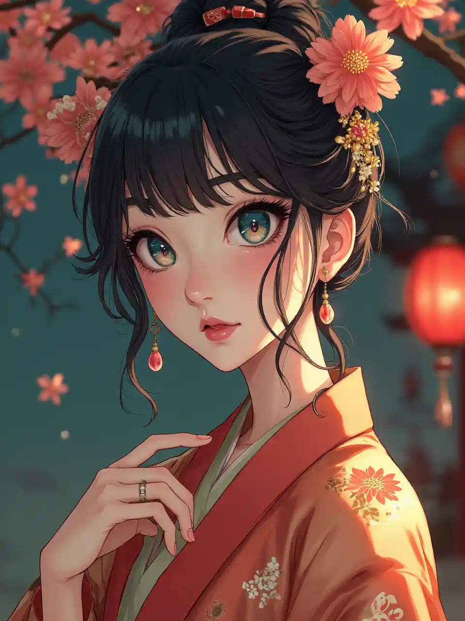 Создать яркую сцену с портретом красивой корейской графической аниме комик создать интенсивное визуальное напряжение (большие голубые глаза и черные волосы, одетые в красивое кимоно). Переплетенные линии и острые углы создают интенсивное визуальное напряжение, в то время как палитра богатых, теплых цветов улучшает общее настроение. Ее кожа блестит при естественном свете, а ее макияж минимален, но элегантен, подчеркивая ее глаза и губы. Сцена должна быть освещена драматической игрой света и тени, подчеркивая контуры. Фон - размытая обстановка во дворе, обеспечивающая мягкий контраст с детальными текстурами ее наряде и ювелирным украшениям. Изображение должно напоминать о жарких летних днях, отражая интенсивность жары и красоту природы в полном цвете.