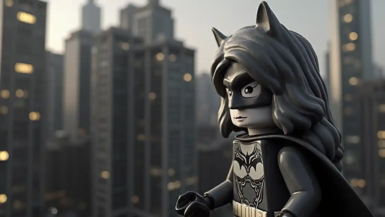 Лего плохая девушка смотрит на город, который выглядит настоящим черно-белым