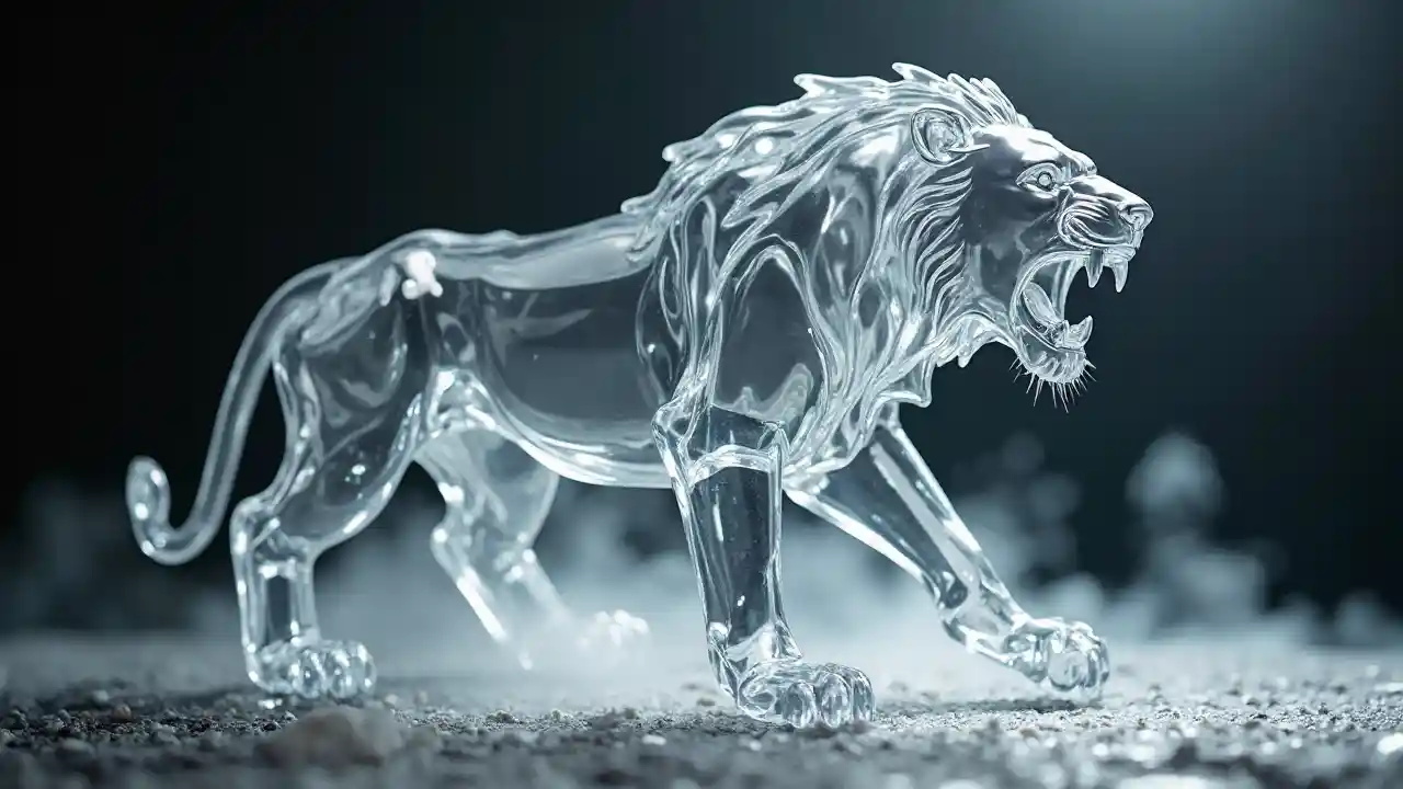 Создать прозрачную стеклянную скульптуру из поликарбона, разгневанного льва, и смотреть вниз от камеры и рыча