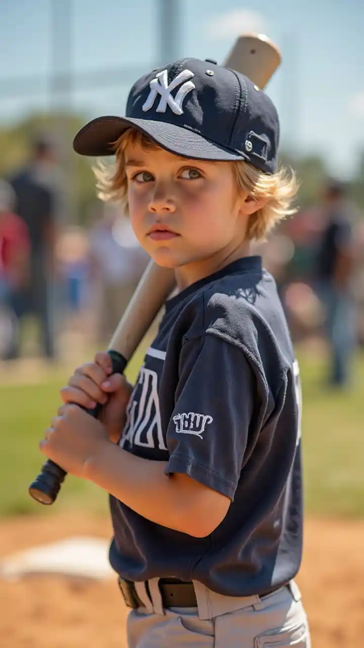 Представьте себе мальчика в бейсбольной шляпе, держащего биту, стоящего на домашней площадке в небольшой лиге. Яркий солнечный свет светит на поле, и воздух наполняется волнением игры. Он готов, его глаза сосредоточены на питчере, а толпа в фоне исчезает. Его выражение лица показывает его решимость сделать идеальный удар, воплощая в себе дух юных соревнований и спортивных.