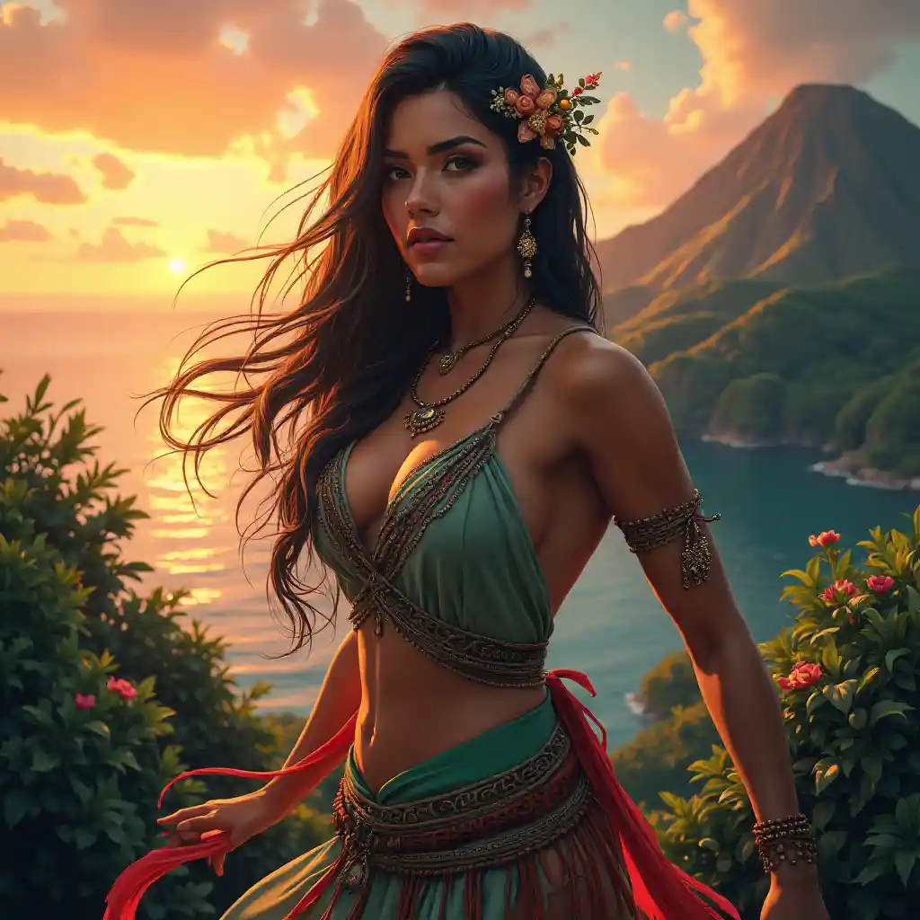 Увлекательный портрет женщины-маори на фоне пышного острова на закате, захватывающий суть стиля Чарли Боутер с объемной атмосферой. Изображение высочайшего качества, с ярким акцентом на ее поразительно красивом лице и тонко сформированных рук. Композиция очень подробная, демонстрируя яркие и сложные элементы с захватывающей точностью в линейном искусстве. Сцена всеобъемлющая и кинематографическая, отображающая максимальную детальность в 4K UHD, заслуживающая признания как награжденный цифровым искусством на ArtStation. Женщина-маори держит динамичную позу, ее форма тщательно выполнена без каких-либо анатомических ошибок, сохраняя равновесие и грациозно. Этот визуальный шедевр не имеет никаких искажений или несовершенств, что обеспечивает увлекательный и безупречный портрет.