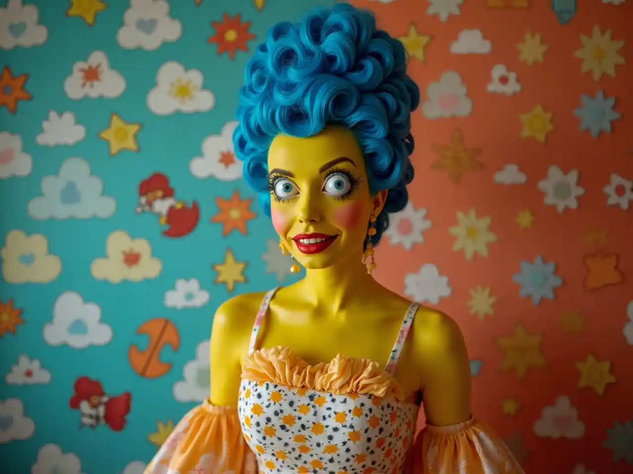 Фотореалистичный, Фото женщины в костюме Мардж Симпсон, Симпсонс ТВ высокая мода, домохозяйка 1950-х годов, волосатый, магический, сны, яркая, гиперреалистичная фотография, сны, эфирная фигура, более высокое сознание, снятое Canon EOS R5 RF 100mm F2. 8 л MACRO IS USM,