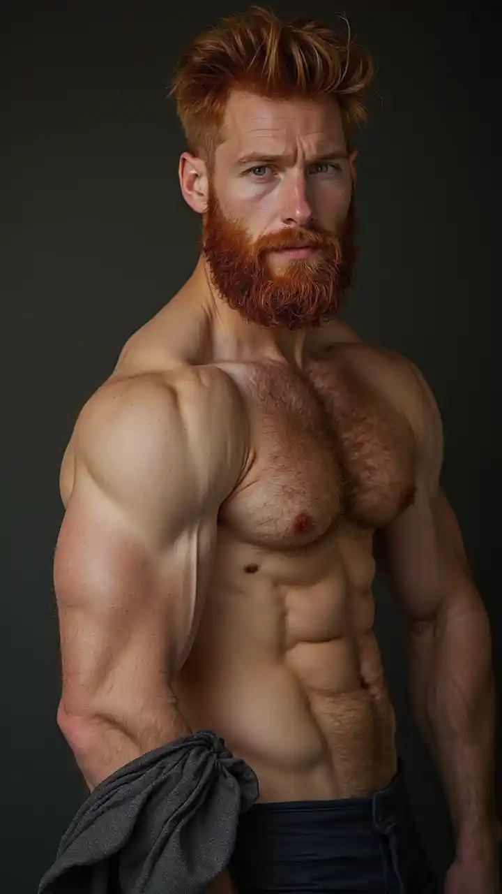 LunaМужчина с мужской бородой и рыжими волосами и большими мышцами